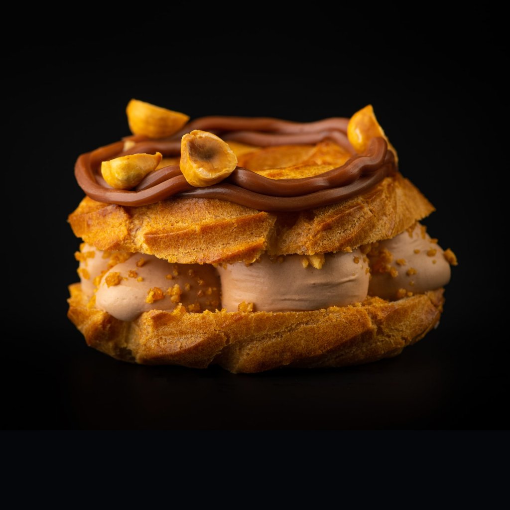 ODPALOVANÉ EKLÉROVÉ TĚSTO NAPLNĚNÉ MLÉČNÝM ČOKOLÁDOVÝM KRÉMEM A LÍSKOOŘÍŠKOVÝM GRILIÁŠEM A POTAŽENÉ MLÉČNOU ČOKOLÁDOU A LÍSKOVÝMI OŘECHY.